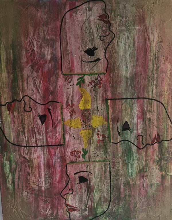 Dieses ausdrucksstarke, abstrakte Kunstwerk zeigt vier stilisierte Gesichter, die kreuzförmig um ein leuchtend gelbes Blütenmotiv angeordnet sind. Die Gesichter sind in reduzierten, schwarzen Linien gezeichnet und wirken ruhig, introspektiv und miteinander verbunden. Im Zentrum steht eine florale Form, die Wachstum, Austausch und innere Balance symbolisiert.
