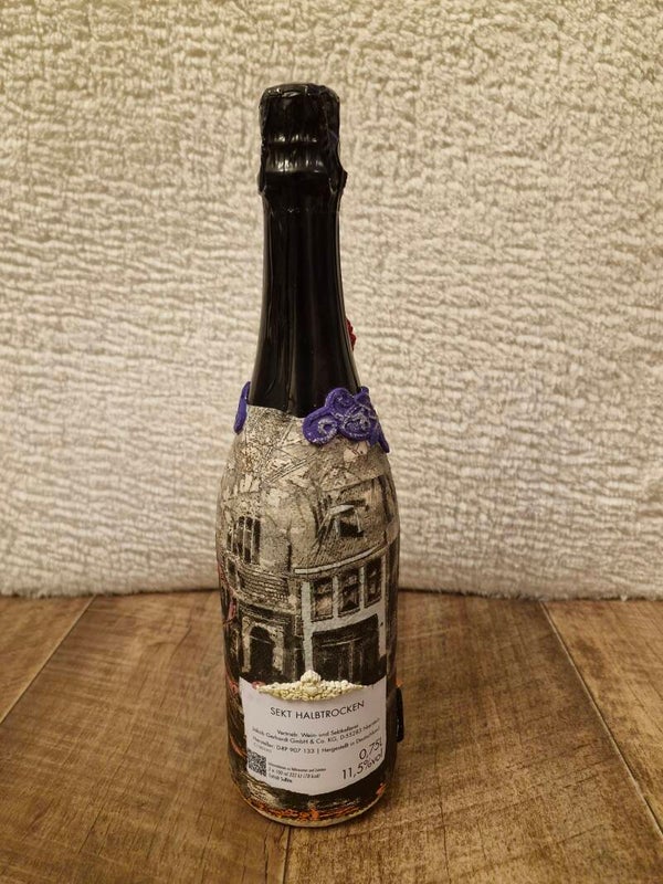 Der obere Bereich ist in tiefem Schwarz gehalten und wird von einer aufwendig gestalteten, violettfarbenen Spitzen-Ornamentmanschette umschlossen. Eine rote Rosenapplikation bildet das elegante Zentrum und verleiht der Flasche einen romantisch-verspielten Charakter. Durch die Kombination aus glänzenden Elementen, strukturierter Oberfläche und kräftigen Farben wirkt Nostro wie ein exklusives Sammlerstück – perfekt als Geschenk, Dekoration oder besonderes Highlight für jede Feier.