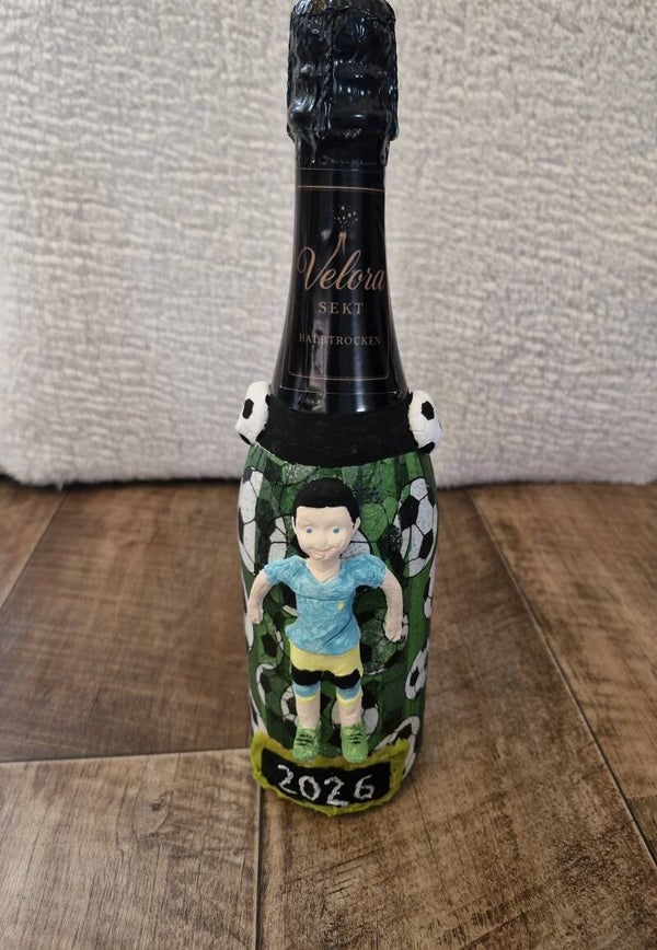 Diese außergewöhnliche Sektflasche ist ein echtes Highlight für kleine und große Fußballfans. Die Flasche wurde in liebevoller Handarbeit dekoriert und zeigt einen plastischen Fußballspieler vor einem dynamischen Ballmotiv. Die aufgebrachte Jahreszahl 2026 macht sie zu einem besonderen Erinnerungs- oder Geschenkstück für Turniere, Geburtstage oder sportliche Meilensteine.