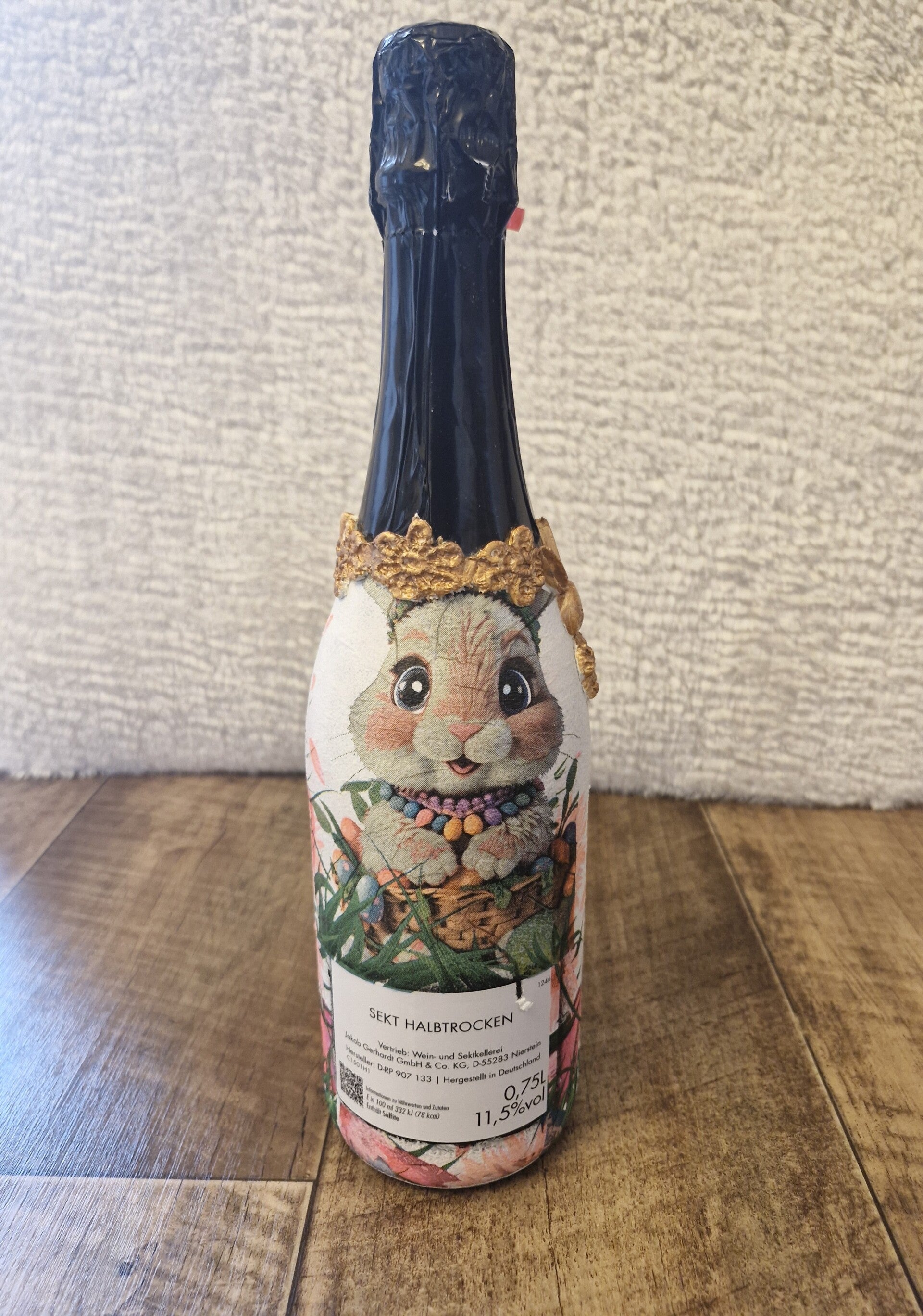 Die detailreiche Gestaltung mit goldenen Akzenten und dem verspielten Osterhasen verleiht der Flasche eine warme, frühlingshafte Ausstrahlung. Ideal für gemütliche Osterbrunches, Kaffeerunden im Café oder als stilvolles Mitbringsel zur Frühlingszeit.
