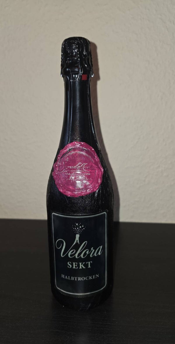 Ein echter Blickfang ist das markante, handversiegelte Wachssiegel in kräftigem Bordeauxrot, das der Flasche einen exklusiven, fast schon kunstvollen Charakter verleiht. Das stilvolle Etikett mit dem geschwungenen Velora-Schriftzug und dezenten silbernen Akzenten unterstreicht die Premium-Positionierung dieses Sekts.