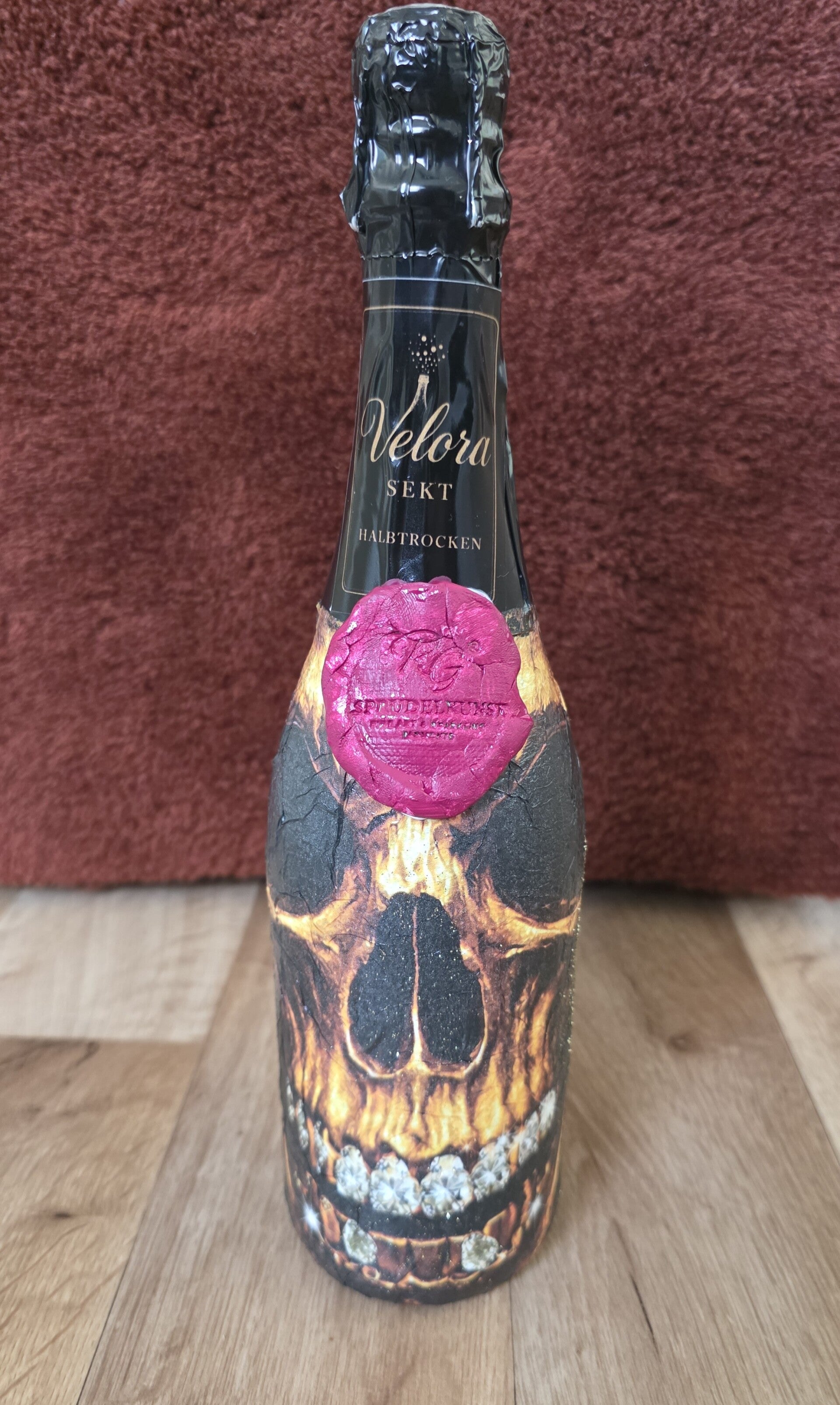 Ein Sekt für alle, die das Außergewöhnliche lieben. Der Skull Edition vereint eleganten halbtrockenen Sekt mit einem provokanten, kunstvollen Flaschendesign. Die Flasche wird von einem dramatischen Totenkopf im Flammenlook geziert, dessen funkelnde Zähne dem Design eine luxuriöse und rebellische Note verleihen.